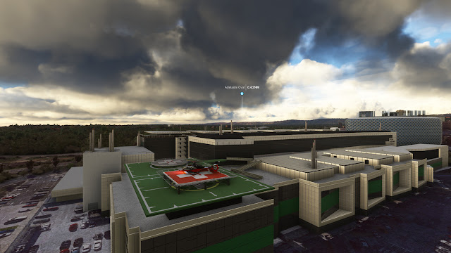 The Royal Adelaide hospital is a POI from the Adelaide City Pack from Orbx. It seems to have had some development since it was first released. As can be seen from the following screenshots, the helipads have been developed and it is possible to land the Airbus H135 helicopter on it. My first legit landing on a helipad!